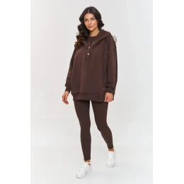 Kompletní set 3v1 s nápami je nabídkou, která se úspěšně osvědčí v mnoha každodenních situacích, spojující pohodlí s módním vzhledem. Sada se skládá z mikiny, topu a legín. Mikina v tomto setu vyniká límečkem zapínacím na knoflíky, co jí dodává stylový, ale také praktický charakter. Volný střih zajistí plnou volnost pohybu, a manžety na rukávech a na spodku mikiny zajišťují pohodlí, přizpůsobují oblečení tělu a brání zvěšování materiálu. Navíc límeček je obohacen o decentní detail ve formě kovových knoflíků. Pruhovaný top má krátký střih, který se skvěle kombinuje s přiléhavými legínami. Jeho jednoduchý střih s okrouhlým výstřihem z něj činí klasický prvek, který lze snadno sladit s jiným oblečením. Legíny jsou také vyrobeny z pruhovaného materiálu, který se dokonale přizpůsobí siluetě, zdůrazňujíce její tvary, ale zároveň zajistí pohodlí. Materiál je elastický, což umožňuje plnou volnost pohybu, ideální na každodenní vycházky nebo cvičení. Kombinace hladké mikiny s topem a legínami vyrobenými z texturovaného materiálu vytváří zajímavý, souvislý a praktický outfit, který splní vaše očekávání bez ohledu na roční období.