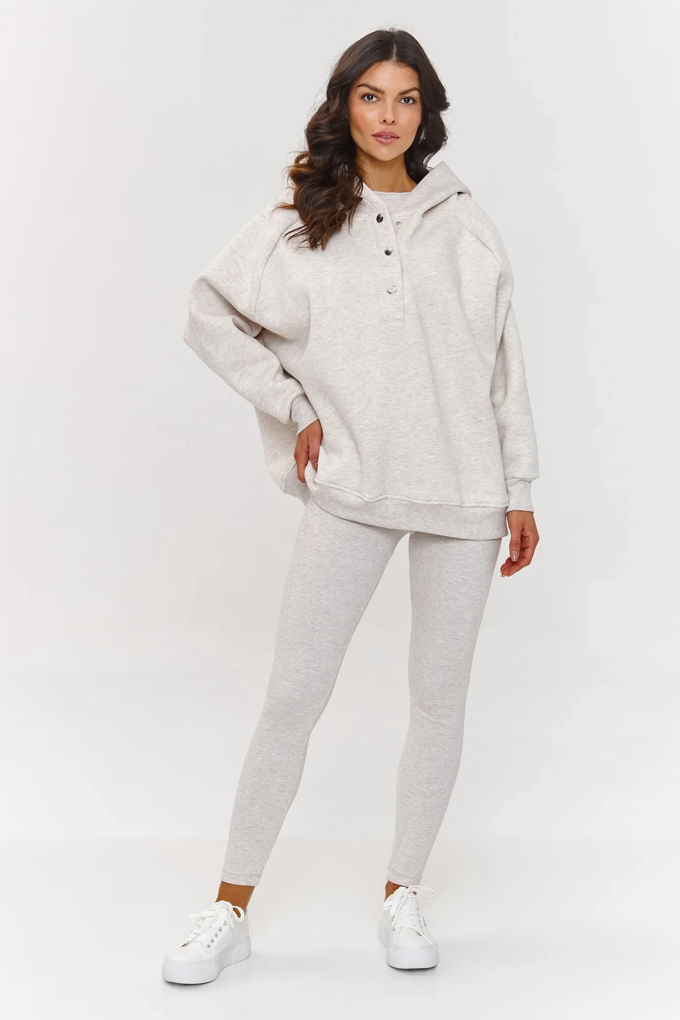 Kompletní 3v1 s nápami je nabídka, která se úspěšně osvědčí v mnoha každodenních situacích, spojující pohodlí s módním vzhledem. Sada se skládá z mikiny, topu a legín. Mikina v této sadě vyniká límcem zapínáním na knoflíky, co jí dodává stylový, ale také praktický charakter. Volný střih zajišťuje plnou volnost pohybů, a pružné manžety na rukávech a u spodu mikiny zajišťují pohodlí, přizpůsobují oblečení tělu a předcházejí zkrucování materiálu. Navíc límec je obohacen o jemný detail v podobě kovových knoflíků. Pruhovaný top má krátký střih, který skvěle ladí s přiléhavými legínami. Jeho jednoduchý střih s kulatým výstřihem z něj činí klasický prvek, který lze snadno zkombinovat s jiným oblečením. Legíny jsou také vyrobeny z pruhovaného materiálu, který se ideálně přizpůsobuje postavě, zdůrazňuje její tvary, ale zároveň zajišťuje pohodlí. Materiál je elastický, což umožňuje plnou volnost pohybů, ideální na každodenní vycházky nebo cvičení. Kombinace hladké mikiny s topem a legínami vyrobenými z texturovaného materiálu vytváří zajímavý, souvislý a praktický outfit, který splní vaše očekávání bez ohledu na roční období.