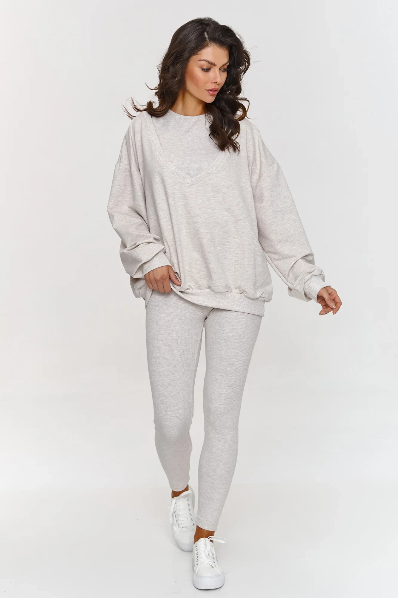 Kompletní souprava je ideální volbou pro ženy hledající pohodlí a styl na každý den. Sada se skládá z oversized mikiny, pruhovaného topu a legín, které společně tvoří souvislý, módní celek. Přiléhavé, pruhované legíny skvěle podtrhují postavu, zajišťují pohodlí a komfort. Přiléhavý top a mikina v nadměrném stylu s hlubokým výstřihem do srdce dokonale vyvažují celkový vzhled a dodávají ženský šarm. Materiál je měkký a příjemný na dotek, ideální na každodenní nošení. Klasická mikina s topem a pruhovanými legínami dává outfitu lehce sportovní charakter. Díky univerzálnosti se tato sada skvěle kombinuje se bílými teniskami, vytvářejíc pohodlný outfit na každý den. Hledala jsi soupravu, která spojuje eleganci s pohodlím? Kompletní souprava s topem a legínami je must-have ve tvé skříni! Ideální kombinace pohodlí, funkčnosti a módního designu. Vhodná na různé příležitosti, od relaxace doma, po setkání s přáteli nebo procházky v parku. Vyber si naši soupravu, která ti dodá jistotu a zajistí pohodlí v každé situaci!