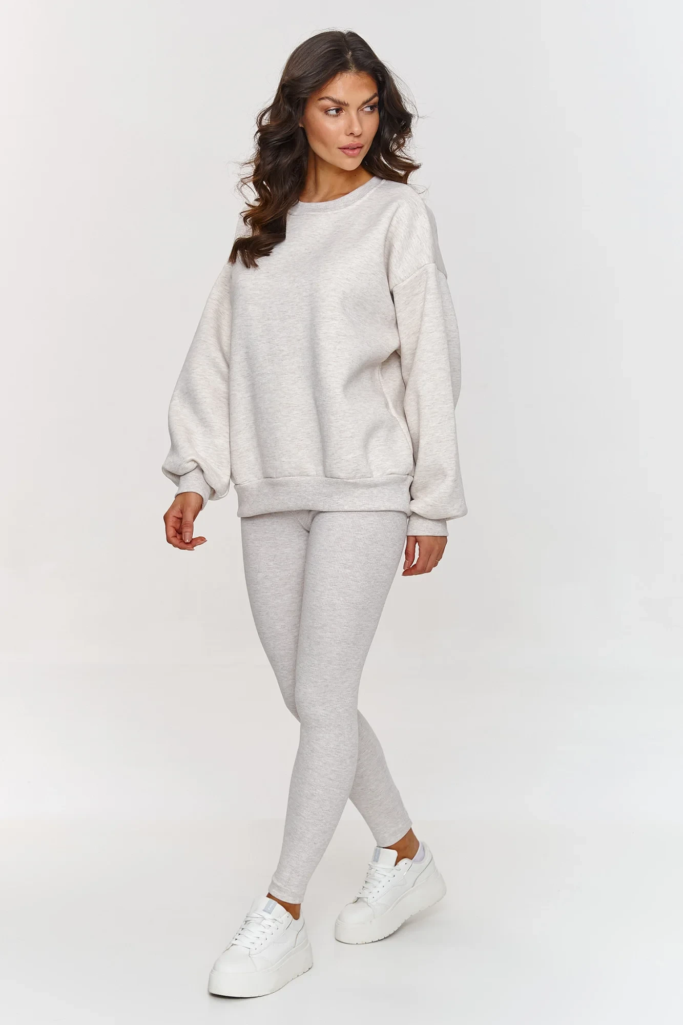 Sada s teplákem a legíny je ideální volbou pro ženy, které ocení pohodlí, ale nechtějí se vzdát módního vzhledu. Tento set vyrobený z vysoce kvalitní bavlny zajistí pohodlí po celý den, bez ohledu na příležitost. Oversize mikina a přiléhavé legíny jsou ideální kombinací pohodlí a stylu. Minimalistický a klasický střih dělá tento set vhodným pro různé stylizace, od casual po sportovní. Mikina vyrobená z trochu tlustšího teplákového materiálu zajistí teplo v chladnějších dnech a legíny z tenčí pruhované látky zaručí ideální rovnováhu celého outfitu. Všestrannost tohoto dresu zaručuje skvělé sladění s bílými teniskami, vytvářející pohodlný outfit na procházku, nákupy nebo setkání s přáteli. Díky elastickým materiálům se tento set hodí i pro různé fyzické aktivity od lehkých tréninků, jógy po relaxaci doma. Hledáte stylový set na každý den? Sada s teplákem a legíny je must-have ve vaší skříni! Hodí se na různé příležitosti a zaručí pohodlí po celý den. Vyberte si set, který spojuje eleganci s každodenním pohodlím!