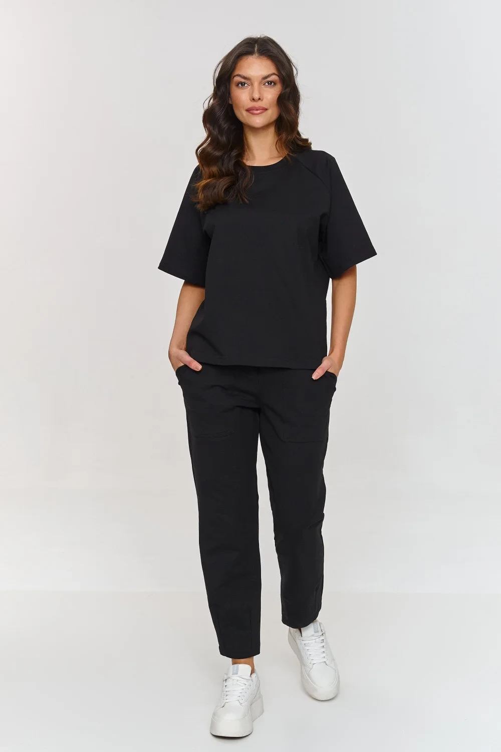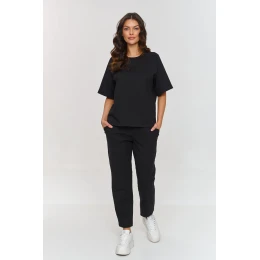 Tento pohodlný teplákový set je ideální volbou pro každodenní outfit a aktivní odpočinek. Má volný svetr s kulatým výstřihem zakončeným jemným lemem a raglánovými rukávy, které jsou skvělé pro ty, kteří chtějí opticky upravit linii ramen. Klasické kalhoty s přímými nohavicemi mají gumový pásek, který umožňuje přizpůsobit se postavě a velké nášivky kapes dodávají stylový akcent a funkčnost. Tato kombinace oblečení vytváří harmonický a pohodlný celek. Jednoduchý a volný střih tohoto setu z něj dělá nadčasový a univerzální kus, který si zachovává svobodu a módní vzhled. Teplákový set je vyroben z prodyšného bavlněného materiálu, což ho činí praktickým i během teplejších dní. Tento set se skvěle hodí na každodenní vycházky, nákupy, setkání s přáteli nebo jiné fyzické aktivity. Tento teplákový set je spojením funkčnosti a stylu, ideální pro ty, kteří chtějí mít pohodlí a zároveň módní vzhled.