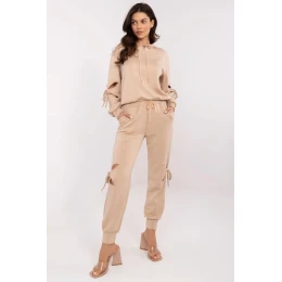 Casualový komplet tepláků je ideální kombinací pohodlí a módního stylu. Vyrobený z měkké směsi viskózy, polyesteru a elastanu, zajišťuje pohodlí při nošení a volnost pohybu. Mikina s kapucí má dlouhý rukáv a jemné rozparky na rukávech s ozdobnými šňůrkami, které dodávají celku originální charakter. Kalhoty s vysokým pasem a vkládacími bočními kapsami zaručují pohodlí, zatímco elastické manžety na nohavicích podtrhují sportovní styl. Další výhodou jsou rozparky na nohavicích s ozdobnými šňůrkami, které dodávají netradiční vzhled. Elastický pas se šňůrkou umožňuje dokonalé přizpůsobení. Je to vynikající volba na každodenní nošení pro ženy, které si cení pohodlí a módního akcentu ve svých stylizacích. Komplet je vyroben z materiálu typu máslo, který je mimořádně měkký, příjemný na dotek a dokonale se přizpůsobuje tělu.