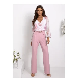 Elegantní a ženský komplet, který ohromuje jemným spojením barev a vzorů. Vzdušný top s přesýpacím dekoltem, zdobený rozmazaným květinovým motivem, dodává lehkost a romantický charakter. Jeho jemný tvar krásně ladí s jednobarevnými kalhotami s gumou v pasu v odstínu špinavě růžové, které zdůrazňují postavu a zajišťují pohodlí. Stylizaci doplňuje opasek s ozdobnou přezkou, jemně zdůrazňující pas. Jedná se o skvělou volbu jak na každý den, tak na speciální příležitosti, kombinující klasiku s moderním šarmem.