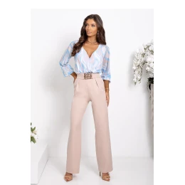 Elegantní a stylový komplet, který ohromuje jemným spojením barev. Vzdušná halenka v jemném vícebarevném vzoru (modrá, béžová) dodává stylizaci lehkost a ženskou eleganci. Klopový výstřih krásně zdůrazňuje krk a volnější střih zajišťuje pohodlné nošení. Kalhoty v jednobarevném béžovém provedení skvěle doplňují celkový vzhled, elastický pás zaručuje ideální přizpůsobení a pásek s ozdobnou sponou zdůrazňuje pas. Toto harmonické spojení klasiky a modernosti je ideální na každou příležitost.