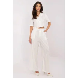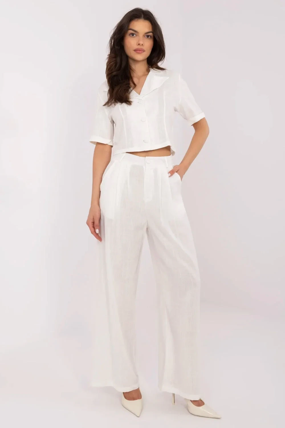 Dámský set skládající se z krátké košile a kalhot je ideální volbou pro každodenní outfit v casual stylu. Vyrobený z prodyšného lnu a viskózy, zaručuje pohodlí a volnost pohybu, skvěle se hodí na teplé dny. Košile s krátkým střihem, s klasickým límečkem a krátkými rukávy, je zapínána na knoflíky, co jí dodává stylový a lehký charakter. Hladký vzor dělá set univerzálním a snadným na stylování. Dlouhé, široké kalhoty s vysokým pasem krásně zdůrazňují pas a opticky prodlužují nohy. Model je zapínán na knoflík a zip, boční kapsy dodávají kalhotám funkčnost. Jedná se o set určený pro ženy, které ocení pohodlí a módní, minimalistický vzhled, skvělý na každý den, do města nebo na letní setkání.