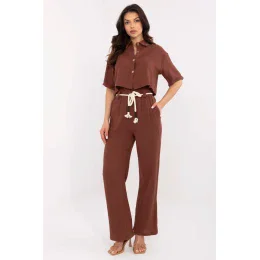 Dámský set s košilí a kalhotami je stylový a pohodlný návrh v casualovém provedení, ideální na každý den. Vyrobený z prodyšné a přírodní směsi lnu a viskózy, zajišťuje pohodlí i v teplejších dnech. Součástí setu je košile s krátkým rukávem, klasickým límcem a zapínáním na knoflíky, která vypadá lehce a nadčasově. Kalhoty s vysokým pasem a přímými nohavicemi byly vybaveny vloženými bočními kapsami a páskem k převázání v pasu, který zdůrazňuje siluetu a přidává ženský akcent. Hladká tkanina a minimalistický střih dělají set mimořádně univerzálním, skvěle se hodí na procházku, nákupy nebo volný den v práci. Přírodní vzhled a ležérní móda!