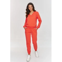 Dámský teplákový set v jednoduché estetice se hodí téměř na každou příležitost. Set se skládá z mikiny s výstřihem na hlavu a klasických a pohodlných kalhot. Mikina nemá kapuci, ale má výstřih do dekoltu s lemováním a zakončením na přehyb, co dodává celému kompletu elegantní nádech. Lemování je také na rukávech a na spodní části mikiny, díky čemuž se dobře přizpůsobuje postavě. Kalhoty jsou vyrobeny ze stejného materiálu, mají boční kapsy a lemování v pasu a na dolní části nohavic. Tento set je skvělou volbou pro ženy, které si cení klasiky a nadčasovosti ve svém šatníku. K němu můžete obout designové tenisky nebo jednoduché tenisky, v každém provedení bude set vypadat velmi stylově.