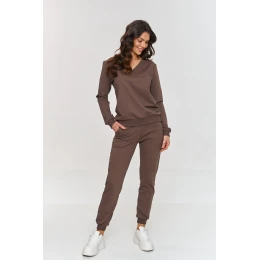Dámská souprava se sportovním oblečením, zachovaná v jednoduché estetice, se hodí téměř na každou příležitost. Souprava se skládá z mikiny s hlavovým výstřihem a klasických a pohodlných kalhot. Mikina nemá kapuci, má však výstřih do šířky ozdobený lemováním a zakončený na límeček, co dodává celému kompletu nádech elegance. Lemování je také přítomné na rukávech a ve spodní části mikiny, díky čemuž se dokonale přizpůsobuje postavě. Kalhoty jsou vyrobeny ze stejného materiálu, mají boční kapsy a lemování v pasu a dolní části nohavic. Tento komplet je skvělou volbou pro ženy, které si cení klasiky a nadčasovosti ve svém šatníku. K tomu si obujte designové tenisky nebo jednoduché tenisky, v každém provedení bude souprava vypadat velmi stylově.