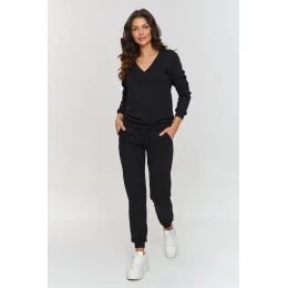 Dámská souprava se sportovním oblečením, zachovaná v jednoduché estetice, se hodí téměř na každou příležitost. Souprava se skládá z mikiny, která se obléká přes hlavu, a klasických a pohodlných kalhot. Mikina nemá kapuci, má však výstřih do V, který je lemován lemovkou a zakončený opletením, což celému kompletu dodává nádech elegance. Lemovky jsou také přítomny na rukávech a v dolní části mikiny, díky tomu se skvěle přizpůsobuje postavě. Kalhoty jsou vyrobeny ze stejného materiálu, mají boční kapsy a lemovky umístěné v pasu a na dolní části nohavic. Tato souprava je skvělou volbou pro ženy, které si ve svém šatníku cení klasiky a nadčasovosti. K ní si obujte designové tenisky nebo jednoduché tenisky, v každém provedení se bude souprava prezentovat velmi stylově.