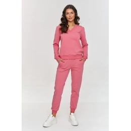 Dámský teplý set, držící se jednoduché estetiky, se hodí téměř na každou příležitost. Set se skládá z mikiny, která se obléká přes hlavu, a klasických a pohodlných kalhot. Mikina nemá kapuci, ale má výstřih do V lemovaný lemem a ukončený na límeček, co dodává kompletnímu outfitu nádech elegance. Lemování je také přítomné na rukávech a ve spodní části mikiny, díky čemuž se skvěle přizpůsobuje postavě. Kalhoty jsou vyrobeny ze stejného materiálu, mají postranní kapsy a lemy umístěné v pasu a na dolní části nohavic. Tento set je skvělou volbou pro ženy, které si cení klasiky a nadčasovosti ve svém šatníku. K tomu si obujte designové tenisky nebo jednoduché tenisky, v každém provedení bude set vypadat velmi stylově.