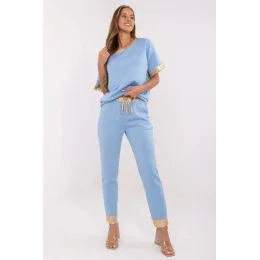 Elegantní a pohodlný dámský set, ideální na každý den. Vyrobený z vysoce kvalitní směsi viskózy, bavlny a elastanu, poskytuje pohodlné nošení a volnost pohybu. Hladký materiál mu dodává elegantní minimalismus a zlaté detaily na nohavicích, rukávech a výstřihu přidávají decentní eleganci. Halenka má krátký rukáv a klasický kulatý výstřih, zatímco kalhoty s vysokým pasem a bočními kapsami zajišťují pohodlí a praktičnost. Dlouhé nohavice s pružnými lemy zdůrazňují ležérní charakter setu. Ideální volba pro ženy ocení styl a pohodlí v každodenních outfitů.