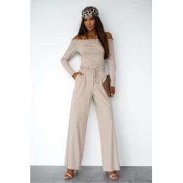 Elegantní dámský set z viskózy s přídavkem elastanu je spojením ženskosti a pohodlí. Blůza s dlouhým rukávem a efektním španělským výstřihem krásně zdůrazňuje ramena a dodává outfitu jemně smyslný charakter. Dlouhé kalhoty s páskem na stahování byly ozdobeny jemným ruchem, který přidává eleganci a lehkost. Praktické kapsy na bocích zvyšují funkčnost setu. Měkký, elastický materiál zajišťuje pohodlí nošení a skvěle se přizpůsobuje siluetě. Set se hodí jak na každodenní nošení, tak na speciální příležitosti.