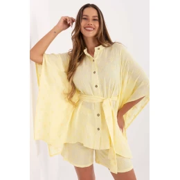 Sada skládající se z košile a krátkých šortek je ideální volbou pro každodenní, pohodlné stylování. Vyrobená z přírodní, prodyšné bavlněné mušelíny s jemným vyšíváním na materiálu, které dodává celku jemnou eleganci. Košile se zapínáním na knoflíky, s pohodlným páskem k uvázání v pasu, má rukáv 3/4 a stylový stojánek u dekoltu, co jí dodává lehkost a moderní charakter. Šortky s jednoduchým střihem a vysokým pasem jsou vybaveny praktickými bočními kapsami a v pase mají pohodlný elastický pásek, který zaručuje ideální přizpůsobení. Celkově vytváří souvislý a pohodlný komplet, skvělý na letní dny a každodenní příležitosti.