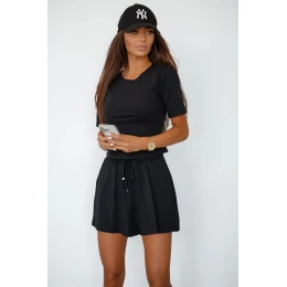 Dámský set z viskózy s přídavkem elastanu je ideální kombinací stylu a pohodlí. Součástí je tričko s krátkým rukávem a klasickým, kulatým výstřihem, které jemně zdůrazňuje postavu a zajišťuje pohodlné nošení. Krátké šortky s elastickým pásem a šňůrkou v pase zaručují perfektní přizpůsobení a postranní kapsy přidávají praktičnost. Lehký, prodyšný materiál s příměsí elastanu dělá tento set měkký, elastický a skvělý jak na každodenní nošení, tak na odpočinek.
