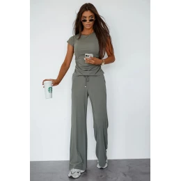 Kompletní s viskózou a přídavkem elastanu je ideální volbou na každý den i na uvolněné příležitosti. Součástí setu je tričko s krátkým rukávem a klasickým kulatým výstřihem, které jemně zdůrazňuje siluetu a zajišťuje pohodlné nošení. Doplňkem setu jsou dlouhé kalhoty s elastickým páskem a vázáním v pase, které umožňují ideální přizpůsobení pasu. Na bocích jsou praktické kapsy. Lehký, prodyšný materiál s příměsí elastanu dělá set měkký, elastický a pohodlný, skvělý jak na odpočinek, tak na každodenní aktivity.