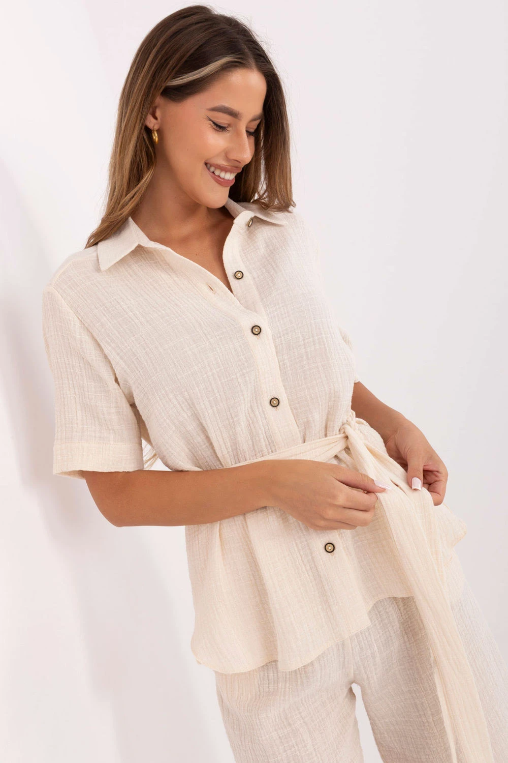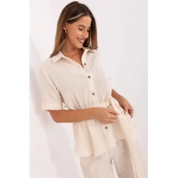 Lehká mušlová sada skládající se z košile a kraťasů je ideální volbou na teplé každodenní dny. Vyrobená z příjemného na dotek, prodyšného bavlněného materiálu zajišťuje maximální pohodlí a volnost pohybu. Hladký materiál zdůrazňuje minimalistický, ležérní styl sady. Košile s krátkým rukávem, límečkem a zapínáním na knoflíky vypadá elegantně a moderně, a dodatečný pásek k zavázání umožňuje zdůraznit pas a dodat ženský tvar postavě. Kraťasy s rovnými nohavicemi a vysokým pasem jsou vybaveny praktickými bočními kapsami. Sada se skvěle hodí na každodenní nošení pro procházku, nákupy nebo setkání s přáteli.