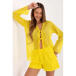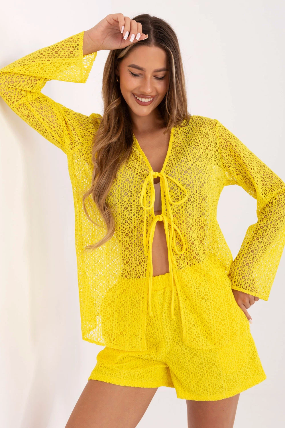 Průhledný dámský set skládající se z košile a šortek je ideální volbou pro každodenní letní casual stylizace. Vyrobený z příjemné směsi bavlny, elastanu a polyesteru nabízí pohodlí nošení a volnost pohybů. Košile s dlouhým rukávem a výstřihem do srdce je zapínána formou stylového vázání, co dodává lehkosti a moderního charakteru celému setu. Šortky s širokými nohavicemi a vysokým pasem jsou vybaveny praktickými bočními kapsami a pohodlnou podšívkou, která zajišťuje pohodlí a diskrétnost. Průhledný vzor dodává setu jemný šarm, čímž ho činí skvělou volbou na teplé dny pro procházku nebo setkání s přáteli.