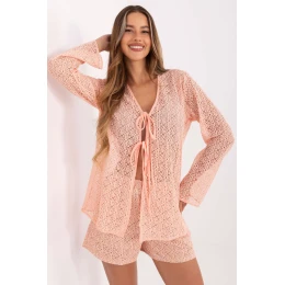 Průsvitný dámský set skládající se z košile a kraťasů je ideální volbou pro každodenní letní stylizace v casual stylu. Vyrobený z příjemné směsi bavlny, elastanu a polyesteru, poskytuje pohodlí nošení a volnost pohybů. Košile s dlouhým rukávem a výstřihem do srdíčka se zapíná formou stylového vázání, co dodává lehkost a moderní charakter celému outfitu. Kraťasy s širokými nohavicemi a vysokým pasem jsou vybaveny praktickými bočními kapsami a pohodlnou podšívkou, která zajišťuje pohodlí a diskrétnost. Průsvitný vzor dodává setu decentní kouzlo a činí ho skvělou volbou na teplé dny jak pro procházku, tak pro setkání s přáteli.