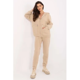 Tento volný dámský set je ideální nabídkou na chladné dny, stylový, pohodlný a příjemně obalující. Vyrobený z vysoké kvality směsi vlny, viskózy, angora a polyesteru, poskytuje vynikající tepelný komfort, měkkost a trvanlivost. Mikina s zipem má praktickou kapuci, dlouhý rukáv a velké nášité kapsy na přední straně, které dodávají charakter a funkčnost. Její jednoduchý, hladký vzor se skvěle hodí k různým doplňkům a osvědčí se jak doma, tak při procházce. Kalhoty s dlouhými, zužujícími se nohavicemi mají vysoký pas a vázání v pase, díky čemuž se skvěle přizpůsobují postavě. Boční, vsunuté kapsy přidávají praktičnost bez narušení minimalistické formy. Tento set je ideální na každodenní aktivity, spojuje volnost pohybu, teplo a stylový vzhled v jednom outfitu.