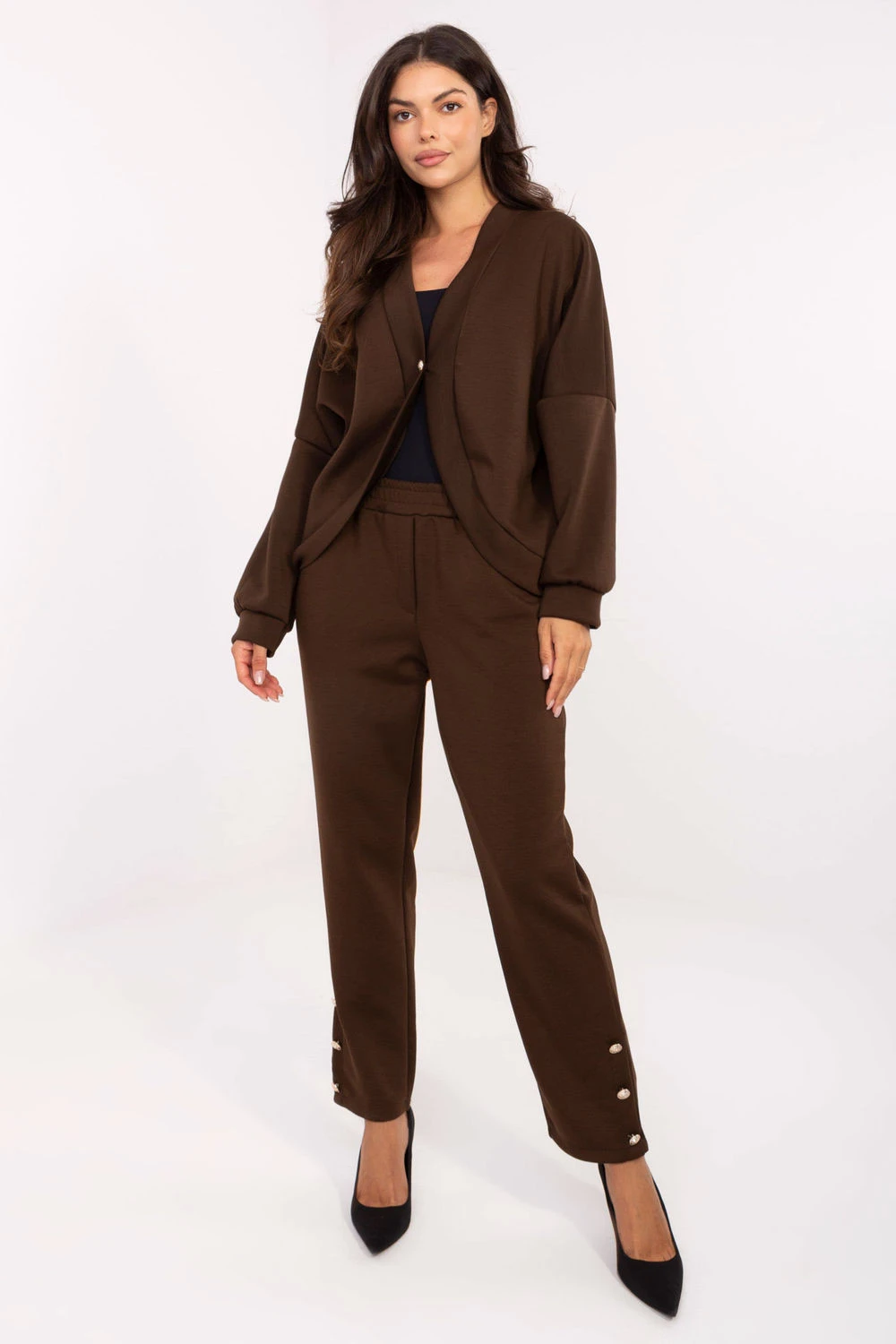 Dámský komplet ve stylu casual je ideální nabídkou pro ženy, které ocení pohodlí a jemnou eleganci každý den. Vyrobený z měkkého, elastického materiálu typu "máslo" (viskóza s přídavkem elastanu) se vyznačuje mimořádnou jemností a příjemností na dotek. Mikina se zapínáním na knoflík s výstřihem do srdce a dlouhými rukávy dodává celku ženský charakter. Kalhoty s vysokým pasem mají pohodlný elastický pas, rovné nohavice a praktické boční kapsy. Na spodním lemu nohavic a v pasu jsou umístěny ozdobné knoflíky, které představují stylový detail podtrhující výjimečný charakter setu. Komplet bude skvělou pohodlnou a módní stylizací na každý den - hladký, univerzální a nadčasový.