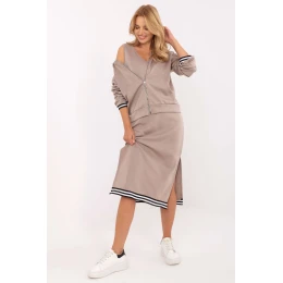 Dámský komplet ve stylu casual je ideální volbou na každý den, spojující pohodlí a ženský charakter. Vyrobený z materiálu typu měkké (viskóza s přídavkem elastanu) ohromuje svou měkkostí, jemností a výjimečnou příjemností na dotek. Mikina s kapucí se zapínáním na zip má dlouhé rukávy, praktické kapsy a ozdobné stahovací pruhy na manžetách, které dodávají celku sportovní nádech. Šaty s ozdobným zakončením o délce midi, s širokými ramínky a výstřihem do V, skvěle ladí s mikinou, vytvářející souvislý a moderní outfit. Tento komplet se hodí do každodenních outfitů, zaručující pohodlí a volnost pohybu, a zároveň stylový a moderní vzhled.