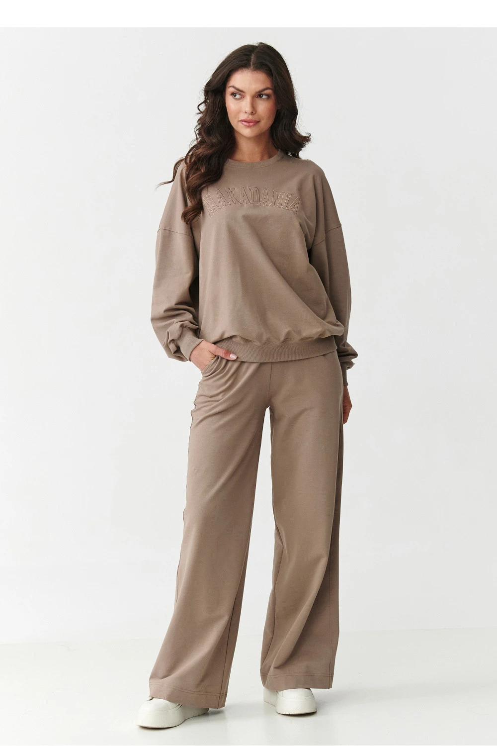 Vsadíme na spojení pohodlí a módního vzhledu s dámským teplákovým kompletem, který se skvěle hodí jak na každý den, tak na volný čas či odpočinek doma. Vyrobený z měkké, prodyšné pleteniny složené z 95 % bavlny a 5 % elastanu zaručuje pohodlné nošení a skvělé přizpůsobení postavě bez omezování pohybu. Horní část setu je klasická mikina s kulatým výstřihem a jemně sníženou linií ramen. Má lehce oversized střih, který stylizaci dodává volnost a moderní charakter. Její výjimečnost zdůrazňuje vyšívaná aplikace s logem na přední straně, která celku dodává originalitu a decentní styl. Kalhoty se vyznačují módním střihem s širokými nohavicemi, které se krásně skládají při pohybu a dodávají postavě lehkost a vyváženost proporcí. Elastický pas a praktické kapsy zvyšují funkčnost a pohodlí nošení. Ideální volba na každou roční dobu, teplákový set s širokými nohavicemi a vyšíváním je must-have v ženské skříni. Pohodlí, kvalita a módní vzhled v jednom setu!