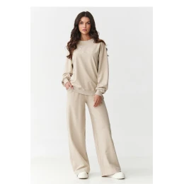 Vsadíte na spojení pohodlí a módního vzhledu s dámským teplákovým setem, který se skvěle hodí jak do každodenního života, tak i na volný čas nebo relaxaci doma. Vyrobený z měkké, prodyšné pleteniny z 95% bavlny a 5% elastanu, zaručuje pohodlí nošení a skvělé přizpůsobení postavy bez omezení pohybu. Horní část setu je klasická mikina s kulatým výstřihem a jemně sníženou linií ramen. Má lehce oversized střih, který dodává stylizaci volnosti a moderního charakteru. Její výjimečnost zdůrazňuje vyšívaná aplikace s logem vpředu, která dodává celku originalitu a decentní styl. Kalhoty se vyznačují módním střihem s širokými nohavicemi, které se krásně usazují při pohybu a dodávají postavě lehkost a vyváženost proporcí. Elastický pas a praktické kapsy zvyšují funkčnost a pohodlí nošení. Ideální volba na každé roční období, teplákový set s širokými nohavicemi a vyšíváním je must-have v ženském šatníku. Pohodlí, kvalita a módní vzhled v jednom setu!