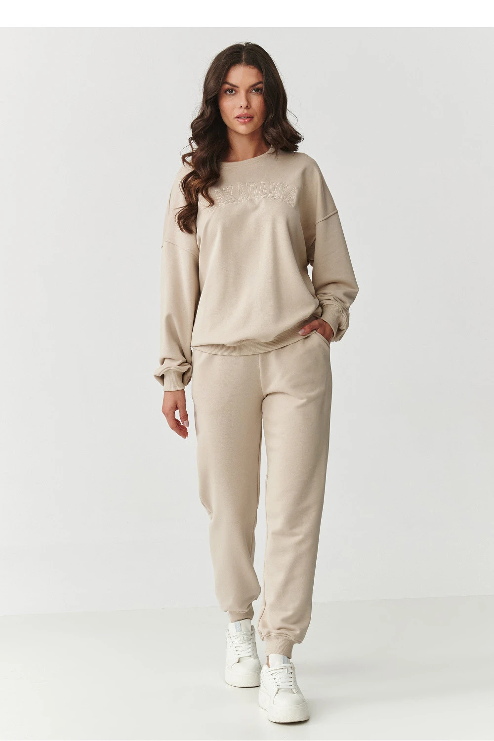 Stylový teplákový set pro ženy, který kombinuje moderní design s výjimečným pohodlím. Vyrobený z vysoce kvalitní látky z 95% bavlny a 5% elastanu, zajistí měkkost, pružnost a ideální přizpůsobení postavě. Jedná se o skvělou volbu do každodenního života, hodí se doma, při procházkách, nákupech nebo víkendovém odpočinku. Hlavním prvkem tohoto setu je vyšívaná aplikace s logem značky na přední straně mikiny, která mu dodává originální charakter a módní výraz. Mikina má volnější střih s obnovenou linií ramen a je zakončena pohodlnými lemy na rukávech a dole, co jí dodává ležérní styl. Kulatý výstřih je také ukončen decentním lemem, co zdůrazňuje jeho nadčasovost. Kalhoty mají elastický pas a lemy na nohavicích, díky čemuž se skvěle drží na postavě a zajišťují pohodlí po celý den. Tento teplákový set je ideálním spojením funkčnosti a stylu. Hodí se jak jako set, tak samostatně. Univerzální střih padne k mnoha příležitostem a zaručuje volnost pohybu bez kompromisů. Vsadte na kvalitu, pohodlí a módní detail a vyberte si teplákový set s vyšívanou aplikací, který zdůrazní Váš styl každý den!