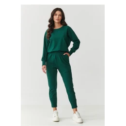 Pohodlný a stylový dámský teplákový set je ideální volbou pro ženy, které ocení pohodlí bez nároku na módní vzhled. Vyrobena z vysoce kvalitního materiálu, kombinace bavlny a elastanu zajišťuje měkkost, pružnost a odolnost, díky čemuž se skvěle hodí jak doma, tak na procházku, nákupy nebo do práce. Mikina má klasický volný střih s dlouhými rukávy zakončenými manžetami, které jí dodávají sportovní charakter. Kulatý výstřih zvýrazňuje její univerzálnost. Klasické kalhoty jsou pohodlné díky volnému střihu a vybavené praktickými velkými kapsami, které nejen skvěle vypadají, ale jsou také velmi funkční. Navíc na spodním lemu nohavic jsou záhyby, což vytváří efekt jemného zužení směrem dolů. Teplákový set se nemačká, dobře snáší praní a udržuje svůj tvar, díky čemuž Ti bude sloužit po mnoho sezón.