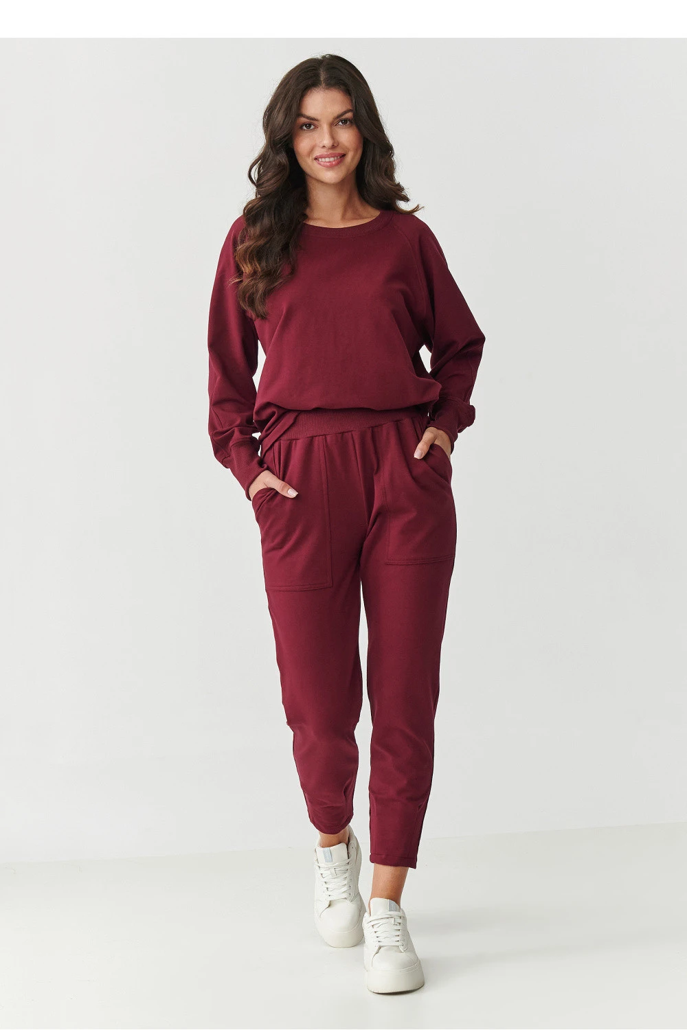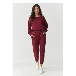 Pohodlný a stylový dámský teplákový set je ideální volbou pro ženy, které ocení pohodlí aniž by musely ustoupit od módního vzhledu. Vyrobený z vysoce kvalitního materiálu, kombinace bavlny a elastanu poskytuje měkkost, pružnost a odolnost, díky čemuž se skvěle hodí jak doma, tak na procházku, nákupy nebo do práce. Mikina má klasický, volný střih s dlouhými rukávy zakončenými manžetami, které jí dodávají sportovní charakter. Kulatý výstřih zvýrazňuje její univerzálnost. Klasické kalhoty jsou pohodlné díky volnému střihu a vybavené praktickými velkými kapsami, které nejen skvěle vypadají, ale jsou také mimořádně funkční. Navíc na spodní části nohavic jsou švy, které vytvářejí efekt jemného zužení ke dnu. Teplákový materiál se nežmolkuje, dobře snáší praní a udržuje si svůj tvar, díky čemuž ti bude sloužit po mnoho sezón.