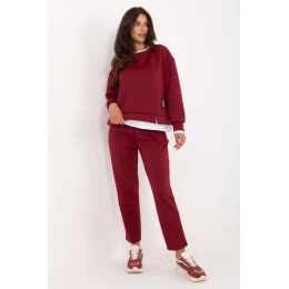 Dámský casual set vyrobený z materiálu typu měkká máslovka, jemný a mimořádně příjemný na dotek. Set se skládá z mikiny s kulatým výstřihem a kalhot s vysokým pasem, vytvářející pohodlný a stylový outfit na každý den. Mikina má dlouhý rukáv, límec a spodní lem podsazené kontrastní látkou a decentní nášivku. Kalhoty s přímými nohavicemi mají vysoký pas s mašlí a bočními kapsami, poskytující pohodlí a moderní střih. Hladký vzor a kombinace viskózy s elastanem zaručuje měkkost, pružnost a volnost pohybů. Je to ideální set na každodenní nošení, který spojuje pohodlí, eleganci a casual styl.