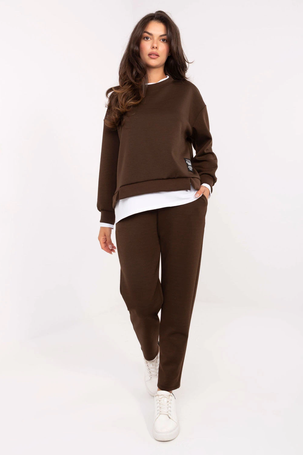Dámský casual set vyrobený z měkkého materiálu typu viskóza, jemné a mimořádně příjemné na dotek. Set se skládá z mikiny s kulatým výstřihem a kalhot s vysokým pasem, vytvářející pohodlný a stylový outfit na každý den. Mikina má dlouhý rukáv, výstřih a lem podsazené kontrastní látkou a decentní nášivku. Kalhoty s rovnými nohavicemi jsou vybaveny vysokým pasem s vázáním a bočními kapsami, zajistí pohodlí a moderní střih. Hladký vzor a spojení viskózy s elastanem zaručuje měkkost, pružnost a volnost pohybů. Jedná se o ideální set na každodenní vycházky, který spojuje pohodlí, eleganci a casual styl.