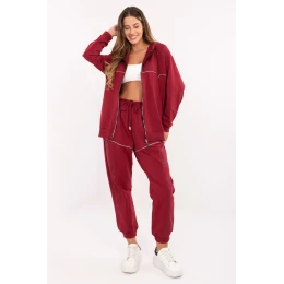 Dámský teplákový set v casual stylu, ideální na každodenní příležitosti. Vyrobený z bavlny s přídavkem elastanu, poskytuje pohodlí a volnost pohybu. Mikina se zapínáním na zip má praktickou kapuci a vložené kapsy, a decentní potisk dodává celku módní charakter. Kalhoty s dlouhými nohavicemi zakončenými manžetami mají vysoký pas a nastavitelný pas na šňůrku, co zaručuje ideální přizpůsobení. Boční vložené kapsy dělají set nejen pohodlným, ale i funkčním. Je to skvělá volba pro ženy, které si váží stylu a pohodlí v jednom.