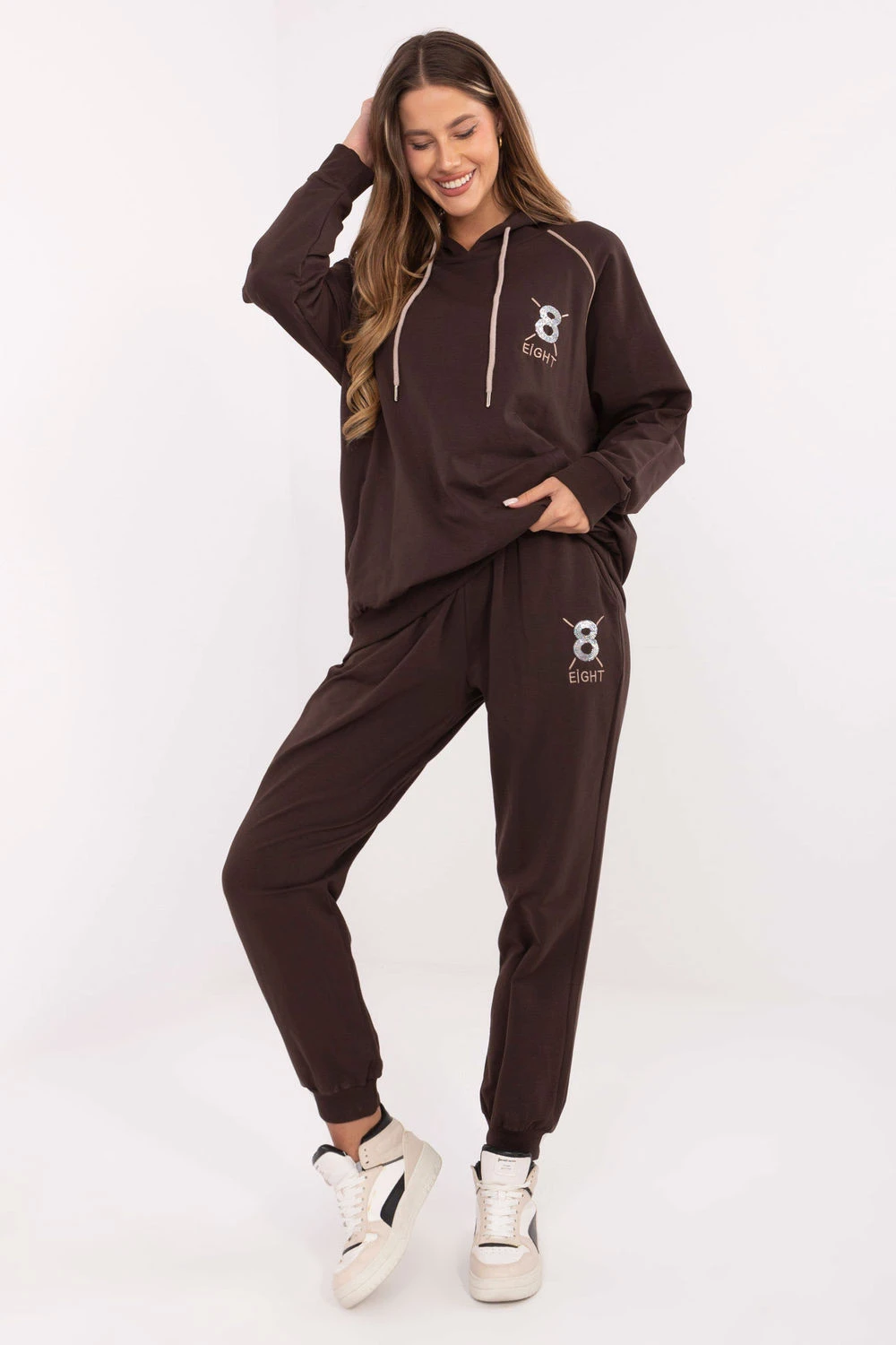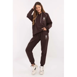 Dámský sportovní set ve casual stylu, navržený pro každodenní outfit. Vyrobený z bavlny s přídavkem elastanu, zaručuje měkkost, pohodlí a volnost pohybu. Mikina s kapucí s nastavitelnými šňůrkami a dlouhým rukávem se vyznačuje vyšívaným motivem na přední straně, zdobeným decentními čiróny, které dodávají celku elegantní akcent. Kalhoty s vysokým pasem a dlouhými nohavicemi zakončenými manžetami mají praktické boční kapsy, díky čemuž jsou pohodlné a funkční zároveň. Jedná se o set, který spojuje sportovní pohodlí s nádechem ženského lesku.