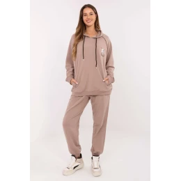 Dámský set dresový ve stylu casual, navržený s ohledem na každodenní stylizace. Vyrobený z bavlny s přídavkem elastanu zaručuje měkkost, pohodlí a volnost pohybu. Mikina s kapucí s nastavitelnými šňůrkami a dlouhým rukávem se vyznačuje vyšívaným motivem na přední straně zdobeným jemnými cirkóny, které dodávají celku elegantní akcent. Kalhoty s vysokým pasem a dlouhými nohavicemi zakončenými pružnými manžetami mají praktické boční kapsy, díky nimž jsou zároveň pohodlné a funkční. Jedná se o set, který spojuje sportovní pohodlí s ženským leskem.