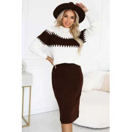 Elegantní set svetrů v čokoládové barvě je ideální kombinací pohodlí a stylu. Dvoudílná sada se skládá z přiléhavé pruhované sukně s praktickými kapsami a měkkého svetru s volnějším střihem, který lze nosit jak klasicky, tak trochu volněji. Vyrobeno z vysoké kvality pleteniny, poskytuje pohodlí a skvěle padne na postavě. Tento set se skvěle hodí do mnoha stylizací, od elegantních kombinací s podpatky po každodenní vzhled s kozačkami nebo teniskami. Je to návrh, který spojuje ženskou eleganci a svobodu na každou příležitost.
