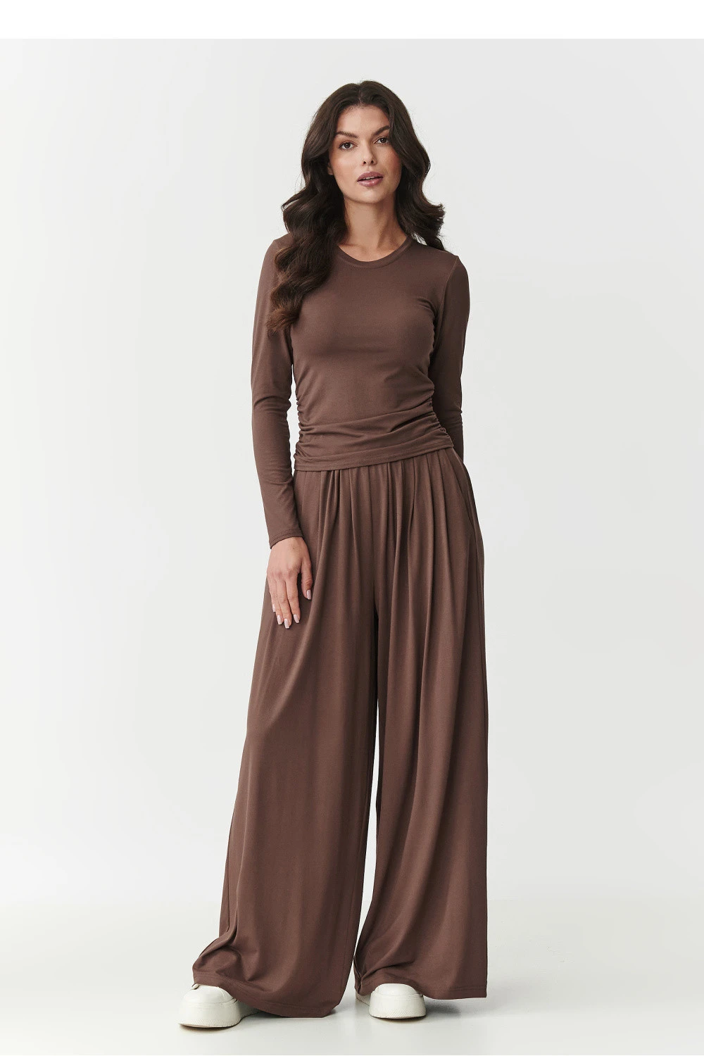 Tento set je ideální nabídkou pro ženy, které hledají spojení pohodlí, stylu a jemnosti. Vyrobený z měkké, příjemné na dotek viskózy se perfektně přizpůsobuje postavě, poskytuje volnost pohybu a pohodlí po celý den. Vrchní část setu tvoří přiléhavý top s dlouhým rukávem, který se vyznačuje decentními záhyby po stranách. Tento ženský detail nejen zdůrazňuje pas, ale také dodává celku elegantní, avšak nenápadný charakter. Toto spojení jednoduchosti s módním detailem z ní činí skvělou volbu nejen jako součást setu, ale také samostatně v mnoha stylizacích. Široké, volně padající kalhoty zaručují pohodlí a styl v jednom. Díky elastickému pasu a volnému střihu se skvěle hodí do pohybu, a boční kapsy jim dodávají funkcionalitu. Jedná se o ideální střih jak pro nošení doma, tak i ve streetových stylizacích. Dámský set je k dispozici v módních, univerzálních barvách: antracitová, černá, čokoládová, khaki a bordová. vsaďte na pohodlí, které jde ruku v ruce s ženským vzhledem, vyberte si set z viskózy, který se přizpůsobí vašemu životnímu stylu a postavě.