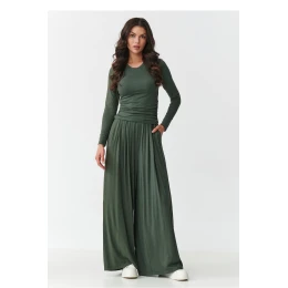 Tento set je ideální nabídkou pro ženy, které hledají spojení pohodlí, stylu a jemnosti. Vyrobený z měkké, příjemné na dotek viskózy, perfektně se přizpůsobuje siluetě, poskytuje volnost pohybu a pohodlí po celý den. Vrchní částí sestavy je přiléhavý top s dlouhým rukávem, který se vyznačuje jemným ruchem na bocích. Tento ženský detail nejen zdůrazňuje pas, ale také celku dodává elegantní, avšak nenáročný charakter. Toto spojení jednoduchosti s módním detailu dělá top skvělým nejen jako součást setu, ale i samostatně v mnoha stylizacích. Široké, volně padající kalhoty jsou zárukou pohodlí a stylu v jednom. Díky elastickému pasu a volnému střihu se skvěle hodí do pohybu a boční kapsy jim přidávají funkčnost. Toto je ideální střih jak pro nošení doma, tak i ve streetových stylizacích. Dámská sestava je k dispozici v módních, univerzálních barvách: antracitová, černá, čokoládová, khaki a bordová. Sáhněte po pohodlí, které jde ruku v ruce s ženským vzhledem, a vyberte si set z viskózy, který se přizpůsobí vašemu životnímu stylu a siluetě.