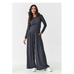Tento set je ideální nabídkou pro ženy, které hledají spojení pohodlí, stylu a jemnosti. Vyrobený z měkké, příjemné na dotek viskózy, skvěle se přizpůsobuje postavě, poskytuje volnost pohybu a pohodlí po celý den. Vrchní částí setu je přiléhavý top s dlouhým rukávem, který se vyznačuje decentními záhyby po stranách. Tento ženský detail nejen zdůrazňuje pas, ale celku dodává elegantní, avšak neformální charakter. Toto spojení jednoduchosti s módním detaily dělá z topu skvělý kousek nejen jako součást setu, ale také samostatně v mnoha outfitových kombinacích. Široké, volně padající kalhoty jsou zárukou pohodlí a stylu v jednom. Díky elastickému pasu a volnému střihu jsou ideální na pohyb a boční kapsy jim dodávají funkčnost. Jedná se o ideální střih jak pro nošení doma, tak i ve streetových stylizacích. Dámský set je k dispozici v módních, univerzálních barvách: antracitová, černá, čokoládová, khaki a bordó. vsaďte na pohodlí, které jde ruku v ruce s ženským vzhledem, vyberte si set z viskózy, který se přizpůsobí vašemu životnímu stylu a postavě.