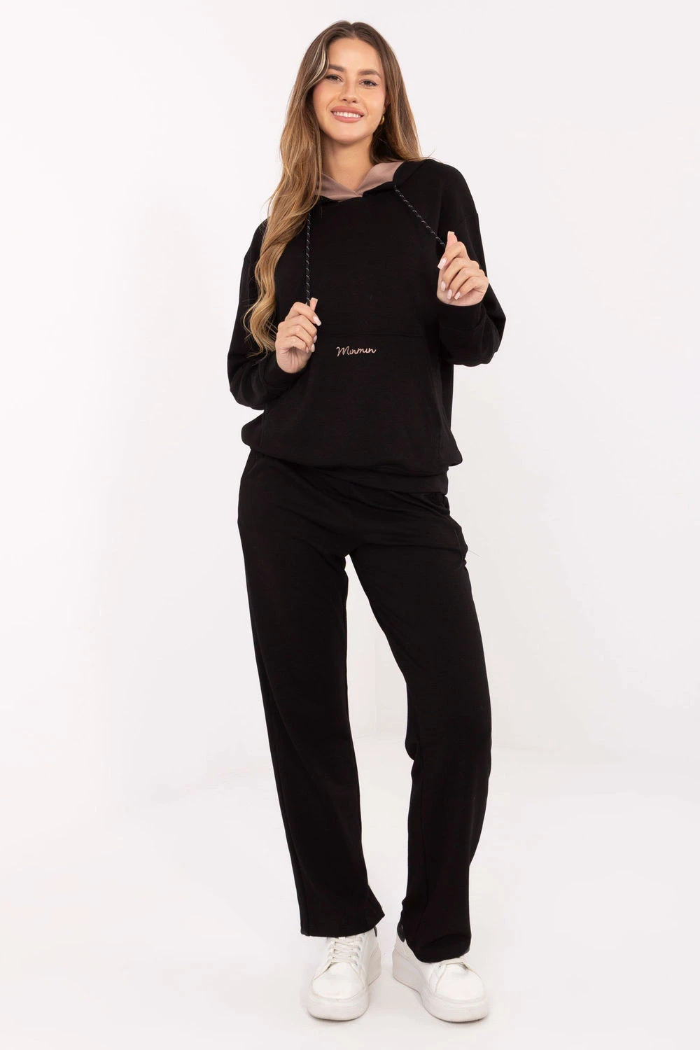 Dámský sportovní set skládající se z mikiny a kalhot ve volném stylu, ideální pro každodenní příležitosti. Vyrobený z mimořádně měkkého materiálu jako másla, jemného a příjemného na dotek, s převahou viskózy a přídavkem elastanu pro větší pohodlí. Mikina standardní délky s dlouhým rukávem, kapucí a praktickou kapsou typu klokánek, zdobená decentním vyšívaným motivem. Kalhoty s vysokým pasem, rovnými nohavicemi a bokovými kapsami, také zdobené malým vyšívaným motivem v páse. Hladký materiál a minimalistický design dělají z tohoto setu spojení pohodlí s moderním stylem.