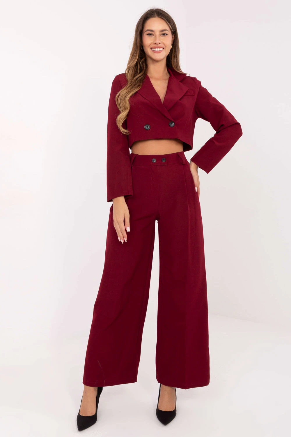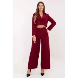 Elegantní dámský set skládající se z krátkého saka a dlouhých kalhot je ideální volbou pro ženy, které ocení spojení elegance a pohodlí. Sako s límci a límečkem je zapínáno na knoflík, a vestavěné polštářky na ramenou dodávají postavě výraznou, ženskou formu a jemně ji tvarují. Kalhoty s dlouhými, širokými nohavicemi a vysokým pasem dokonale zdůrazňují pas a opticky prodlužují nohy. Zapínání na zip a knoflík zaručuje pohodlí nošení, a boční kapsy s průchodem dodávají praktičnost. Set ohromuje precizním střihem a univerzálním charakterem, skvěle se hodí jak na každý den, tak do elegantnějších stylizací. Ideální volba do kanceláře, na schůzku nebo večerní vycházku.