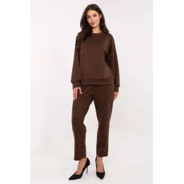 Elegantní a pohodlný dámský teplákový set je nabídkou pro ženy, které oceňují eleganci v každodenním provedení. Sada se skládá z mikiny a kalhot, vytvářejíc harmonický celek s výrazně ženským charakterem. Model je vyroben z měkké směsi viskózy a polyesteru, která skvěle padne na postavu, poskytuje pohodlí při nošení a estetický vzhled. Celý povrch látky zdobí decentní aplikace s flitry, které dodávají setu elegantní, vizitkový styl. Kalhoty s vysokým pasem, přímými, dlouhými nohavicemi a šněrováním v pase zdůrazňují pas a zajišťují ideální přizpůsobení. Boční kapsy přidávají praktičnost a volnost při každodenním používání. Tento set se skvěle hodí na různé příležitosti, je ideální do práce, na schůzky i do každodenního života. Spojuje v sobě pohodlí teplákové soupravy s elegancí vizitkového stylu, vytvářejíc univerzální a moderní vzhled.