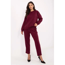 Elegantní a pohodlný dámský teplákový set je nabídkou pro ženy, které ocení eleganci v každodenním provedení. Sada se skládá z mikiny a kalhot, vytvářejíc harmonický celek s výrazně ženským charakterem. Model je vyroben z měkké směsi viskózy a polyesteru, která skvěle padne a zajišťuje pohodlí a estetický vzhled. Celý materiál zdobí jemná aplikace z flitrů, dodávající setu elegantní, společenský styl. Kalhoty s vysokým pasem, rovnými, dlouhými nohavicemi a šněrováním v pase zdůrazňují pas a zajišťují ideální přizpůsobení. Boční kapsy dodávají praktičnost a volnost v každodenním používání. Tento set se skvěle hodí na mnoho příležitostí - je ideální do práce, na schůzky i každodenní nošení. Kombinuje pohodlí teplákové soupravy s elegancí společenského stylu, vytvářejíc univerzální a moderní vzhled.