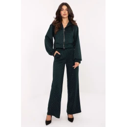 Elegantní a pohodlná dámská souprava dresů je ideální kombinací elegance a pohodlí na každý den. Souprava se skládá z mikiny se zipem a kapucí a kalhot s elastickým pasem, vytvářející módní a zároveň praktický celek. Model je vyroben z vysoce kvalitní směsi viskózy a polyesteru s různorodou fakturou materiálu, která se krásně skládá a zajišťuje pohodlí při nošení. Celý povrch zdobí efektní aplikace z lesklých kamenů, která dodává soupravě elegantní charakter a decentní lesk. Kalhoty s vysokým pasem, širokými, dlouhými nohavicemi a bočními kapsami zaručují pohodlí a volnost pohybu. Mikina s dlouhým rukávem dokonale doplňuje celek, činí soupravu ideální na každodenní stylizace, od volných výletů po setkání v elegantním, městském stylu. Tato souprava je kombinací pohodlí dresu a rafinovaného vzhledu, který vám umožní vypadat stylově a cítit se volně v každé situaci.