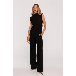 Moderní a elegantní dámský set ušitý z hladké pleteniny, která je měkká, elastická a mimořádně pohodlná na nošení. Toto spojení pohodlí s rafinovaným stylem je ideální jak na každodenní nošení, tak i na speciální příležitosti. Bezrukávový top okouzlí přiléhavým střihem, polo rolákem a decentním zástřihem, který podtrhuje siluetu a dodává jí lehkost. Asymetrické zakončení dole přidává moderní akcent a opticky zúžuje postavu. Kalhoty s volným střihem mají široké nohavice a záložky v pase, díky čemuž se krásně usazují na postavě a zajišťují plnou volnost pohybu. Boční kapsy přidávají funkčnost, a skrytý zip vzadu zajistí estetické dokončení. Set nemá podšívku, což ho dělá lehkým a prodyšným. Celý set byl navržen a ušit v Polsku s důrazem na každý detail. Tento dvoudílný set je skvělou volbou pro ženy, které oceňují pohodlí, eleganci a moderní minimalismus.