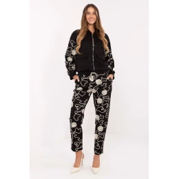 Elegantní a pohodlná dámská tepláková souprava skládající se z mikiny s zipem a kalhot s páskem. Vyrobená z vysoce kvalitní směsi viskózy a polyesteru, poskytuje měkkost, pružnost a pohodlí po celý den. Mikina má casual střih s límcem, dlouhými rukávy a kapsami s klopnami na přední straně, které jí dodávají charakter a praktičnost. Kalhoty mají vysoký pas, zužující se nohavice a boční kapsy, což zajišťuje pohodlí a moderní vzhled. Celý outfit zdobí ozdobné vyšívání umístěné na rukávech mikiny a na přední straně kalhot, které dodávají soupravě výjimečný, elegantní charakter. Tento casual set je ideální volbou pro každodenní outfit, spojující pohodlí, moderní design a ženský detail.