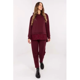 Elegantní a pohodlný dámský set v casual stylu, ideální na každý den. Vyroben z vysoce kvalitní směsi viskózy a elastanu, je elastický, prodyšný a mimořádně příjemný na dotek, což zaručuje maximální pohodlí nošení. Součástí setu je mikina s kapucí a kalhoty s dlouhými, zužujícími se nohavicemi. Mikina je zdobená aplikací z jehel a krajkovými vložkami na zádech, zadní části rukávů a dole vpředu, což dodává celku jemnou eleganci. Kalhoty mají vsazený gumový pas a boční kapsy, díky čemuž jsou pohodlné a praktické. Jedná se o skvělý set pro ženy, které ocení spojení pohodlí, ženskosti a módních detailů, ideální pro každodenní stylování, procházky nebo setkání s přáteli.