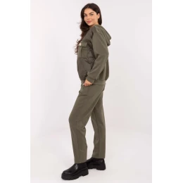 Elegantní set tvořený mikinou a kalhotami, ideální pro každodenní, neformální stylizace. Vyroben z vysoce kvalitní viskózy s různorodou fakturou, z měkkého, jemného a velmi příjemného materiálu, který zaručuje maximální pohodlí při nošení. Mikina má dlouhý rukáv a praktickou kapuci, přední část zdobí ozdobné prošívaní, které dává celku moderní charakter. Model je zapínán na zip, co zvyšuje uživatelský komfort. Na hladině hrudníku jsou kapsy s patkami, ozdobené elegantními brožemi, dodávajícími jemnou originalitu a stylové dokončení. Kalhoty mají vysoký pas, zužující se nohavice a gumu v pasu s dodatečným šňůrkováním, což zajišťuje ideální přizpůsobení a pohodlí. Jsou také vybaveny bočními kapsami, které jsou praktické na každý den. Nohavice jsou dlouhé, pohodlné a skvěle padnoucí na postavu. Set ohromí kombinací pohodlí, funkčnosti a módních detailů, ideální pro ženy, které si cení stylového vzhledu v neformálním provedení.