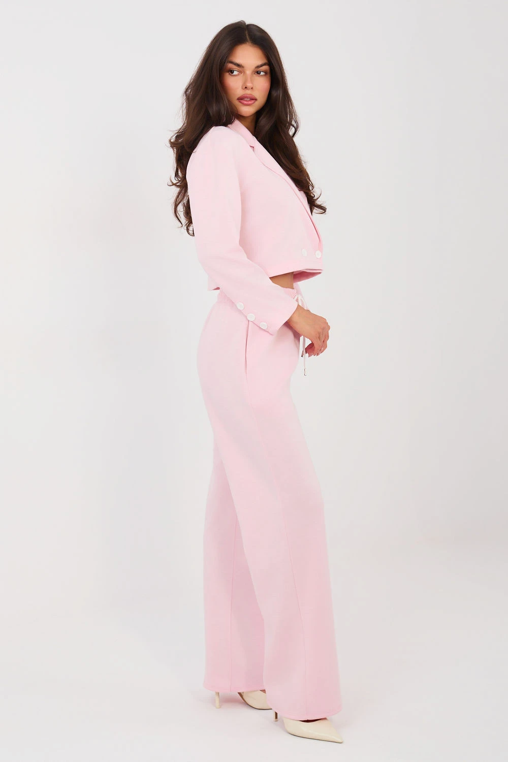 Elegantní dresový set: sako a kalhoty, které spojují eleganci s každodenním pohodlím. Vyrobeno z mimořádně příjemného materiálu, který je jemný, měkký a hladký, zajišťuje maximální pohodlí a skvělé přizpůsobení siluetě. Sako s límci a límečkem, zapínání na knoflíky, dodává celku moderní a ležérní charakter. Dlouhý rukáv s ozdobnými knoflíky je stylovým detail, který zdůrazňuje precizní provedení. Kalhoty s vysokým pasem, dlouhými přímými nohavicemi a vázaným pásem zaručují pohodlí a volnost pohybu. Model je vybaven bočními kapsami, které zvyšují funkčnost setu. Hladký vzor a pečlivě vybraná směs polyesteru, viskózy a elastanu zajišťují, že set se skvěle hodí jak do každodenních stylizací, tak do práce v módním a pohodlném provedení. Je to ideální nabídka pro ženy, které si cení stylu, pohodlí a všestrannosti v jednom setu.