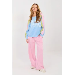 Moderní dámský dresový set skládající se z mikiny a kalhot, držící se casual stylu, ideální na každý den. Skvěle se hodí pro každodenní aktivity, procházky nebo relaxaci v domácím úkrytu. Vyrobený z vysoce kvalitní směsi polyesteru, viskózy a elastanu, která poskytuje pohodlí, pružnost a dobré přizpůsobení se postavě. Mikina s dlouhým rukávem a klasickým kulatým výstřihem byla ozdobena nápisem na přední straně, což dodává celku moderní charakter. Kalhoty s dlouhými, širokými nohavicemi a vysokým pasem zaručují pohodlí nošení, a boční kapsy zvyšují funkcionalitu. Pruhy na rukávech mikiny představují stylový prvek zdůrazňující sportovně-městský vzhled.